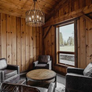 The dark wood panelling and furnishings, red-draped fourposter bed, and black stone bathroom evoke the charm of a secluded Sierra Nevada.